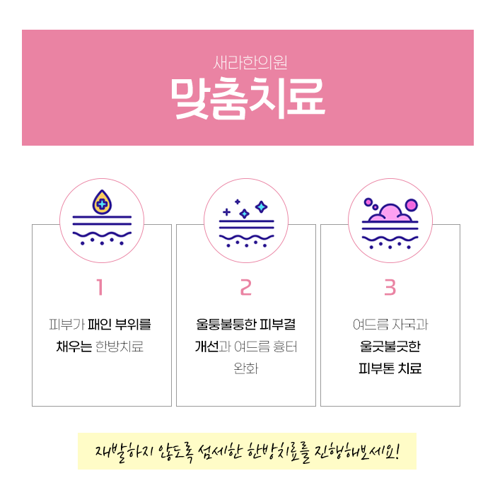 여드름 자국은 피부의 자연스러운 회복 과정에서 발생할 수 있는 문제로 이를 위해서는 제때의 치료와 관리가 필수입니다. 개인 체질에 맞춰 한약을 처방해 드리기도 합니다. 한의학에서는 체내의 균형이 중요하다고 생각하며 체내에 열이 몰려 있는 상태라면 이를 진정시키는 약재를 조합하여 재발 가능성을 줄이고 있습니다.