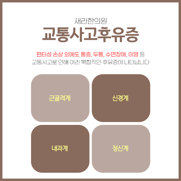 경미한 충돌이라 하더라도 목이나 허리의 근육과 인대에 미세한 손상이 발생할 수 있으며 시간이 흐르면서 통증이 나타나거나 움직임에 제한이 생길 수 있습니다. 이와 같은 사고 후유증은 일상생활에 큰 영향을 미칠 수 있습니다. 사고 후에는 집중력이 떨어지거나 불면증이 생기며 불편함을 느끼는 경우도 많습니다. 사고 후에는 신속하게 신체 상태를 파악하고 초기 단계에서 신방화역야간진료한의원 치료를 받는 것이 바람직합니다.