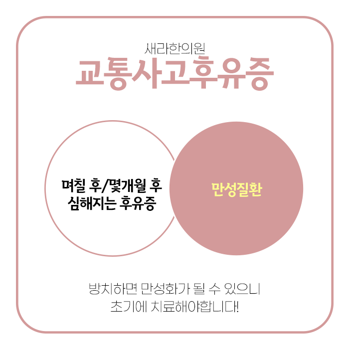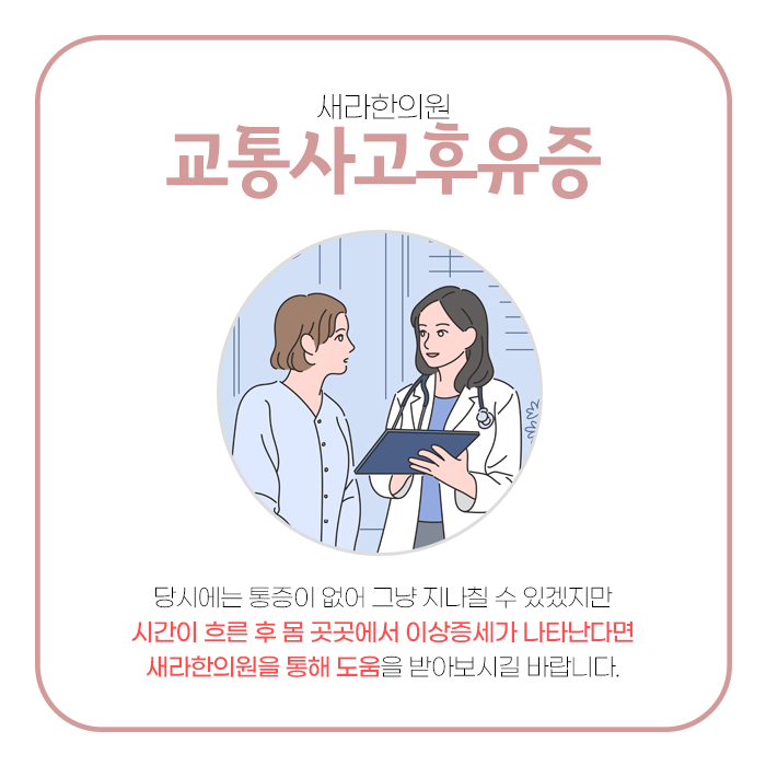 증상이 심해지고 만성화되어 치료가 더욱 어려워지기 전에 늦지 않게 교통사고 후유증 치료 경험이 풍부한 의료기관에 방문하시어 몸 상태를 정확히 진단받고 초기에 제대로 관리받으셔서 건강을 지켜내시기를 바랍니다.
