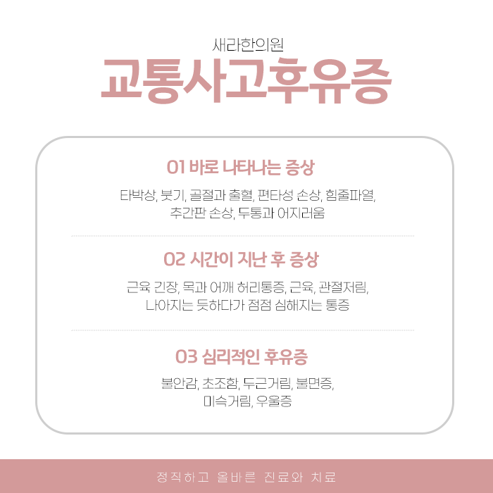 교통사고가 발생하면 사고 현장을 수습하고 자동차에 긁힌 곳은 없는지 확인하거나 사고 현장을 정리하는 데 집중하게 됩니다. 하지만 사고 처리 절차보다 가장 먼저 해야 할 일은 건강 상태를 확인받는 것입니다. 후유증의 가장 흔하고도 간과하기 쉬운 특징 중 하나는 사고 당일 몸이 갑자기 긴장하고 경직되면서 통증을 제대로 느끼지 못할 수도 있다는 것입니다.