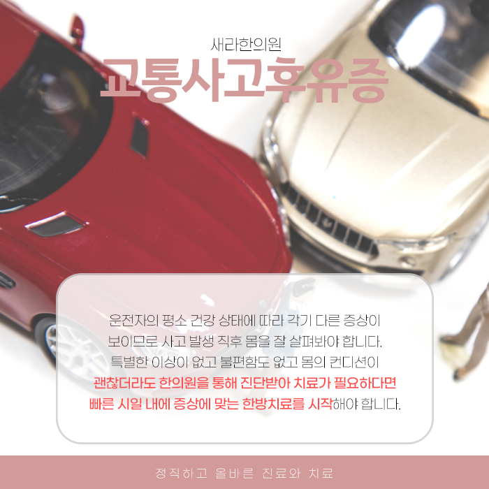 혹시라도 교통사고를 겪으셨다면 사고 규모나 겉으로 보이는 외상 유무, 당장의 통증 유무와 관계없이 지체하지 마시고 가급적 빨리 마곡야간진료한의원에 방문하시어 현재 몸 상태에 맞는 치료를 시작하시는 것이 좋습니다. 사고 직후 아프지 않으니까 괜찮겠지하고 가볍게 여기는 것은 앞으로 나타날 수 있는 더 큰 문제를 키우는 것 입니다.
