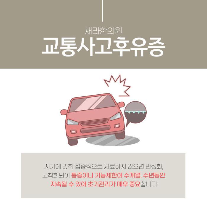 몸에 남아 나타나는 모든 종류의 증상들을 통틀어 교통사고 후유증이라고 부릅니다. 후유증은 사고 규모에 상관없이 발생할 수 있으며 사람마다 나타나는 증상이나 시기가 다를 수 있습니다. 몸에 불편함이 느껴지는데도 사고 때문인지 어떻게 치료를 시작해야 할지 몰라 막막하고 답답해하시는 분들이 많으십니다.