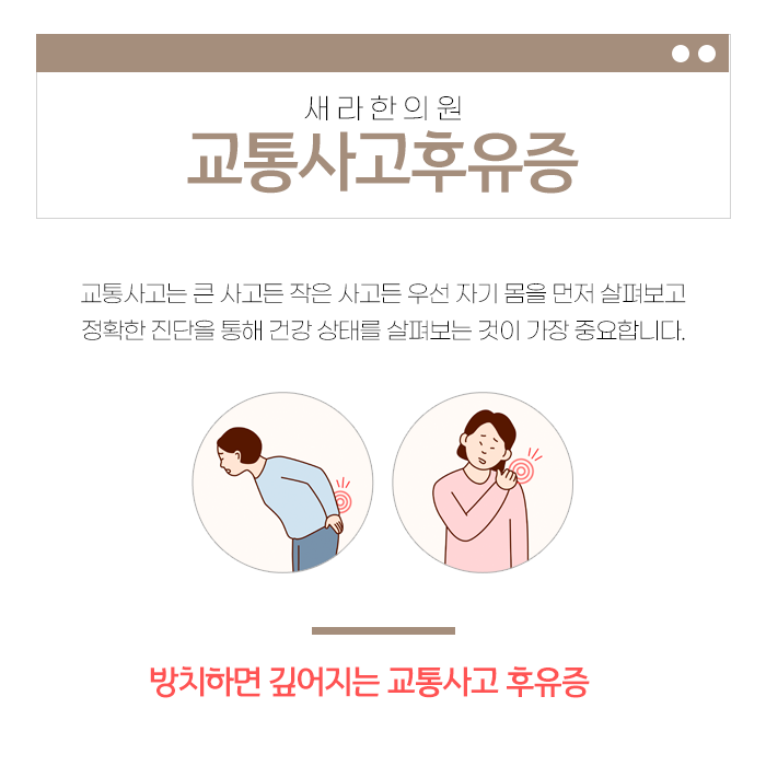 왜냐하면 이 시기에 몸 안에 생긴 문제를 개선하면 이후의 회복 속도를 높이고 후유증의 만성화를 효과적으로 막을 수 있기 때문입니다. 교통사고 후유증으로 불편함을 겪고 계시다면 시간이 지나면 괜찮아지겠지 하고 망설이거나 통증을 참지마시길바랍니다.