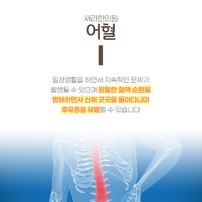사고 후 충분히 쉬어도 피로가 풀리지 않고 몸이 뻐근하며 설명되지 않는 아픔이 느껴진다면 어혈이 뭉쳐 있다는 것을 의미하기도 합니다. 어혈이 몸 안에 쌓여 있으면 다양한 후유증 증상들을 유발합니다. 피의 흐름을 방해하고 몸의 기능을 떨어뜨릴 수 있으므로 어혈을 빠르게 개선해 주는 것이 통증 완화와 건강한 회복을 위해 중요합니다.