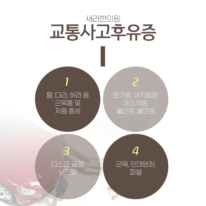 교통사고 후유증으로 인한 통증은 일상생활을 힘들게 합니다. 후유증에서 벗어나 건강을 되찾기 위해서는 몸 상태에 대한 정확한 진단이 필수입니다. 정확한 진단을 바탕으로 알맞은 치료 방법으로 빠르게 회복하실 수 있도록 최선을 다하고 있습니다. 감사합니다.