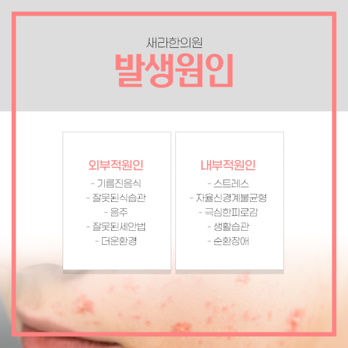 피부에 특별한 자극을 주지 않았는데도 불구하고 붉음이 쉽게 가라앉지 않고 계속된다면 몸 내부의 열 때문일 수 있습니다. 열이 얼굴이나 피부로 몰리면서 염증을 유발하고 악화시킨다고 봅니다.