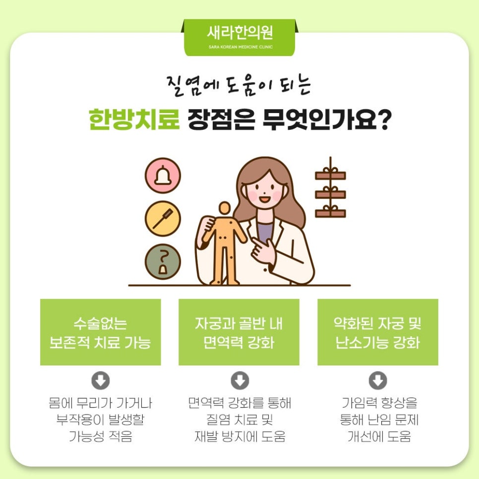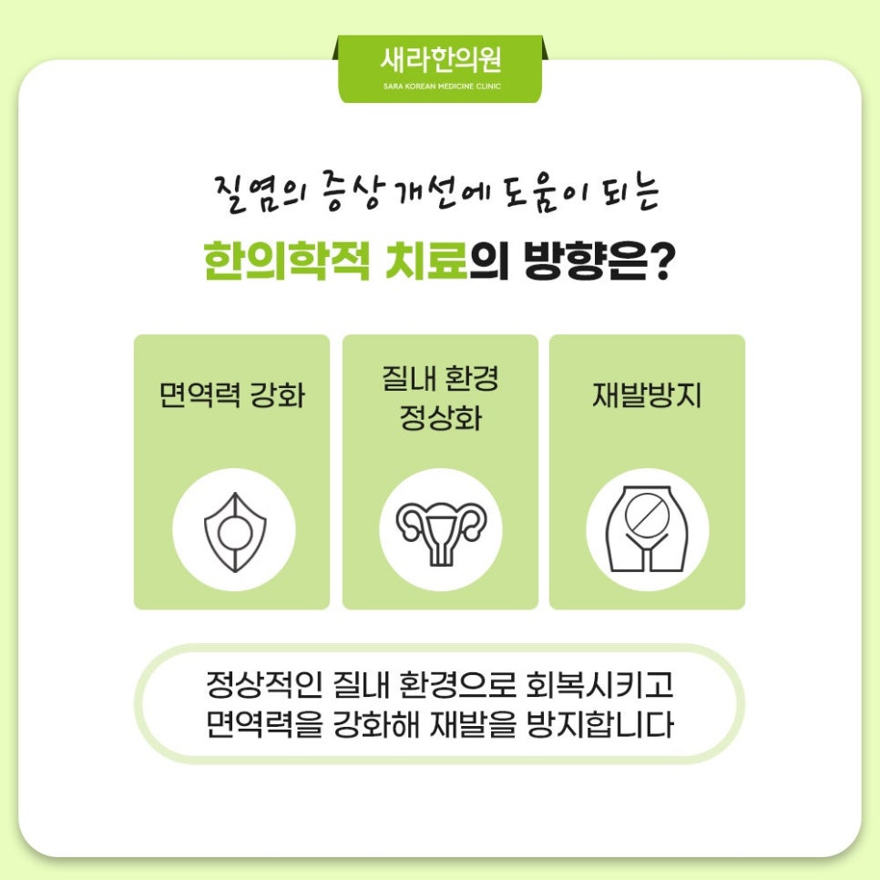 저희 방화부인과 한의원에서는 질염 치료와 재발 방지를 위해서 면역력 강화에 중점을 두고 여러 한의학적 치료 요법을 활용합니다. 질염 주된 발생 원인은 면역력 저하인데요. 그래서 전체적인 신체 면역력 강화에 도움될 저희 한의원의 한방 치료요법은 질염 개선에 도움될 방법이라고 할 수도 있답니다. 침술요법부터 약침요법, 한약처방, 온열요법 등과 같은 여러 한의학적 치료로 하복부 외에 골반강의 혈액 순환을 개선하면서 면역력을 강화하여 질염 치료와 재발 방지를 돕는데요. 이러한 한의학적 치료로 자궁과 생식기 및 질 내 환경 건강을 회복하여 질염 재발 방지에 도움을 드립니다.