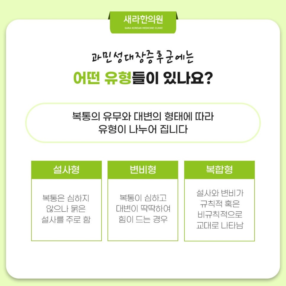 과민성대장증후군은 그 증상과 대변 특성에 따라서 몇 가지 유형으로 나뉘는데요. 첫 번째 유형인 설사형은 복통이 비교적 경미하고 주로 묽은 대변이 나오는 특징이 있습니다. 두 번째 유형인 변비형은 강한 복통을 동반하고 굳은 대변이 나오는게 특징이며 변비 증상이 주로 발생한답니다. 마지막으로 복합형 과민성대장증후군은 묽은 설사와 굳은 대변이 번갈아 나오게 되는 것으로 두 가지 증상은 혼재하는게 특징이라고 합니다.