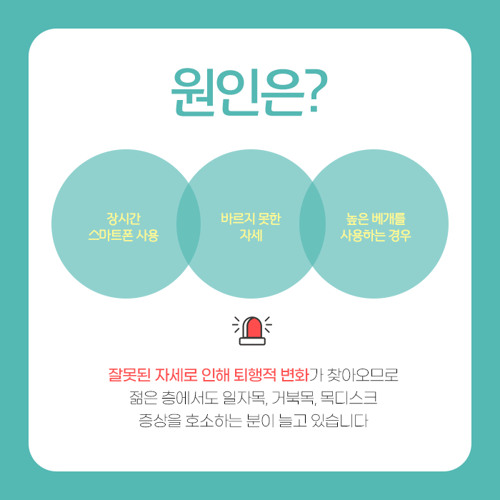 이러한 상태가 지속되면 목뼈 사이의 디스크에 가해지는 압력이 증가하고 디스크가 튀어나와 신경을 압박하는 목디스크로 이어질 위험이 높아집니다. 모니터를 낮게 보거나 스마트폰을 눈높이보다 아래에 두고 사용하는 것은 목을 앞으로 숙이는 자세를 유발하고 목뼈에 부담을 줍니다.