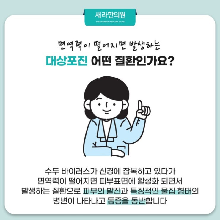여러분들은 대상포진에 걸려본 적이 있으신가요? 대상포진은 극심한 통증을 일으키는 질환으로 알려졌는데요. 오늘은 저희 한의원에서 우리 신체 면역력이 떨어지면서 발생하기 쉬운 대상포진에 대해서 얘기를 해보겠습니다. 면역력이 저하된다면 우리 신체는 여러 질환에 취약해지는데 이로 인해서 생기는 대표적 질환 중에 하나가 바로 대상포진이라고 합니다. 이전에는 주로 노화로 인해서 면역력이 떨어지며 노년층에서 주로 발병하게 되는 질환으로 여겼으나 최근 과도한 업무, 학업 등으로 인해 스트레스에 노출되기 쉬운 젊은 세대도 쉽게 생기는 질환으로 여겨진답니다.