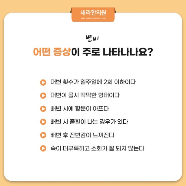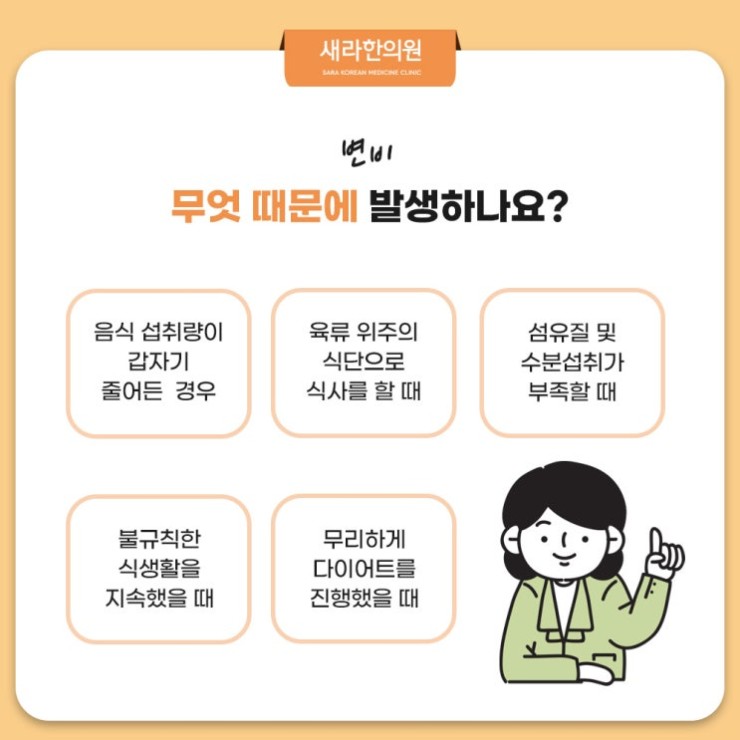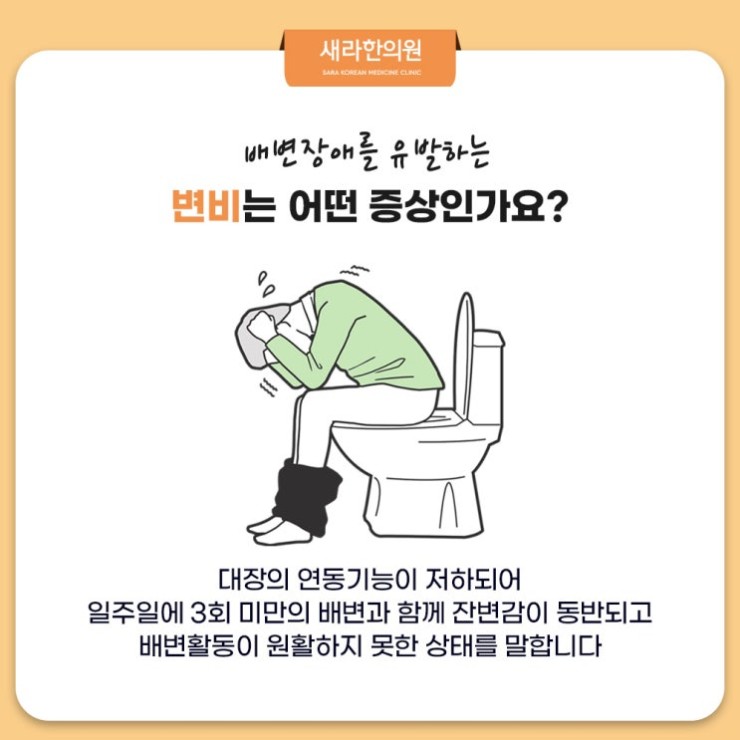 안녕하세요. 오늘은 저희 한의원에서 변비로 어려움이 있으신 분들을 위해 정보를 제공드리려 합니다. 변비를 겪는 분들은 원활하기 못한 배변활동으로 많은 불편함도 경험합니다. 변비는 일생을 살아가며 적어도 한 번 이상은 겪는 흔하고 일반적인 증상 중에 하나인데요. 이러한 변비는 대장의 운동성이 떨어지며 정상적으로 원활하게 배변하기 어려운 상태인데요. 현대 사회를 살아가는 우리들에게 흔히 생기는 증상 중 하나로 대부분의 경우 변비를 심각하지 않은 증상으로 생각하는 경우도 많답니다. 하지만 변비를 방치하면 치질과 같은 항문질환을 일으킬 수 있는 요인이 되어 주의해야 할 것입니다. 그러면 변비는 왜 발생할까요? 변비는 부적절한 식생활을 지속하거나 운동과 활동이 부족할 때 수분을 충분히 섭취하지 못하면 주로 발생한답니다. 이 외에 학업, 업무 스트레스 등이 과도하게 가중될 때 변비가 발생합니다.