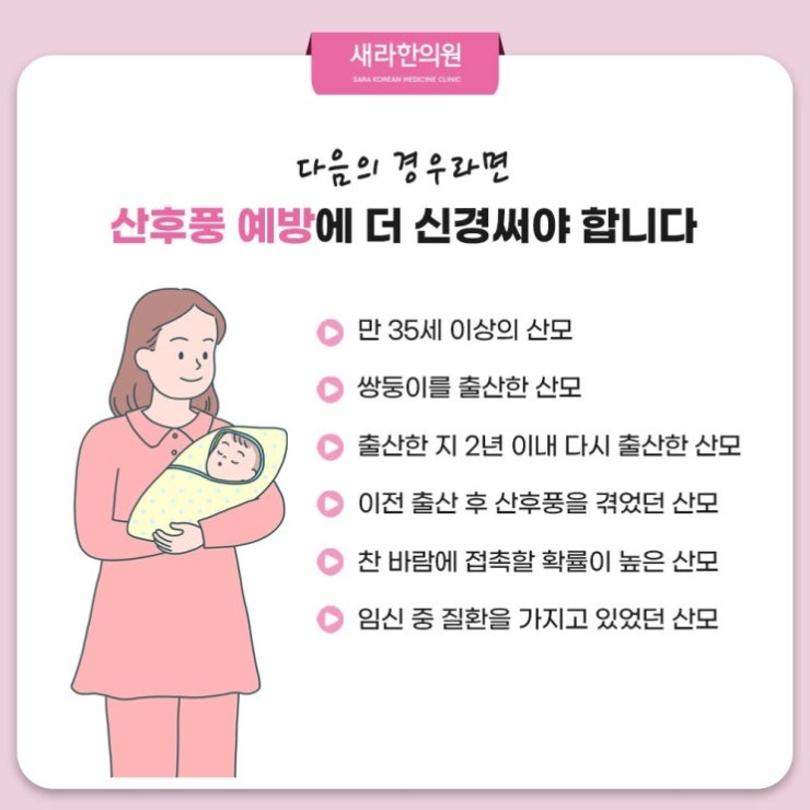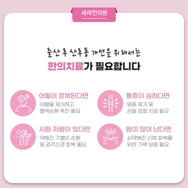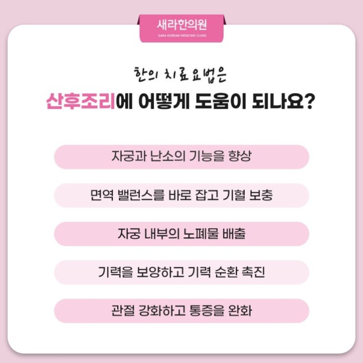 임신과 출산을 거치면서 산모의 몸은 상당한 부담에 시달리게 됩니다. 무엇보다 기력과 기혈을 크게 소모할 수밖에 없어 면역력이 저하된 모습이 보이고 출산하는 동안 생기는 출혈 일부는 자궁 쪽에 어혈이랑 이름의 노폐물로 남습니다. 또한 아이를 원활하게 낳도록 느슨해진 관절은 출산 할 때 도움을 주는 요소의 하나지만 출산 이후에 오히려 몸이 틀어지고 통증을 유발하게 되는 원인이 된답니다.