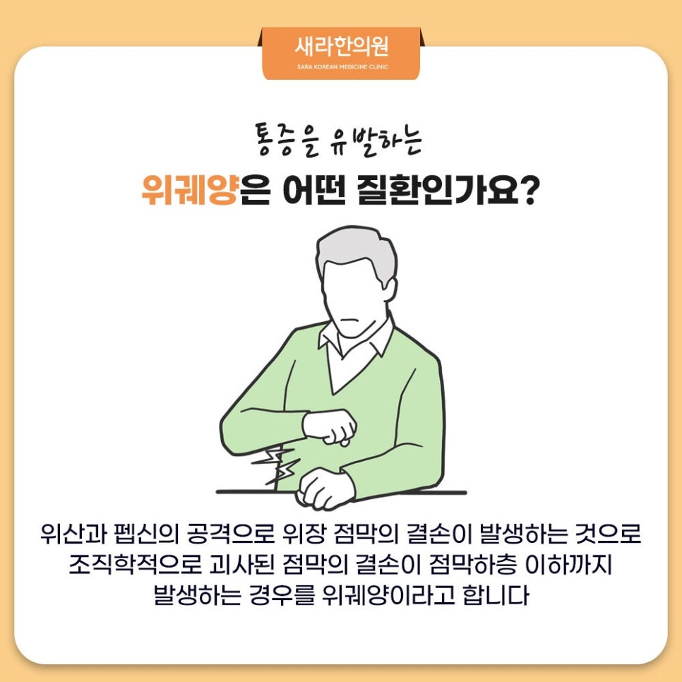 위궤양은 위벽의 점막 손상 혹은 궤양 형성을 특징으로 하는 질환이라고 한답니다. 이는 보통 위 점막의 보호 기능이 약화나 직접적인 손상으로 발생하고 위산과 소화 효소의 추가적 작용으로 궤양 부위가 더 악화합니다. 위궤양의 주요 원인은 헬리코박터 파일로리(Helicobacter Pylori) 균에 의한 감염, 과도한 스트레스, 유전적 요인, 흡연과 과도한 음주 등이 있답니다. 또 아스피린, 비스테로이드성 소염진통제(NSAIDs)와 같은 일부 약물의 사용이 위 점막을 손상시키면서 위궤양도 유발하게 됩니다.