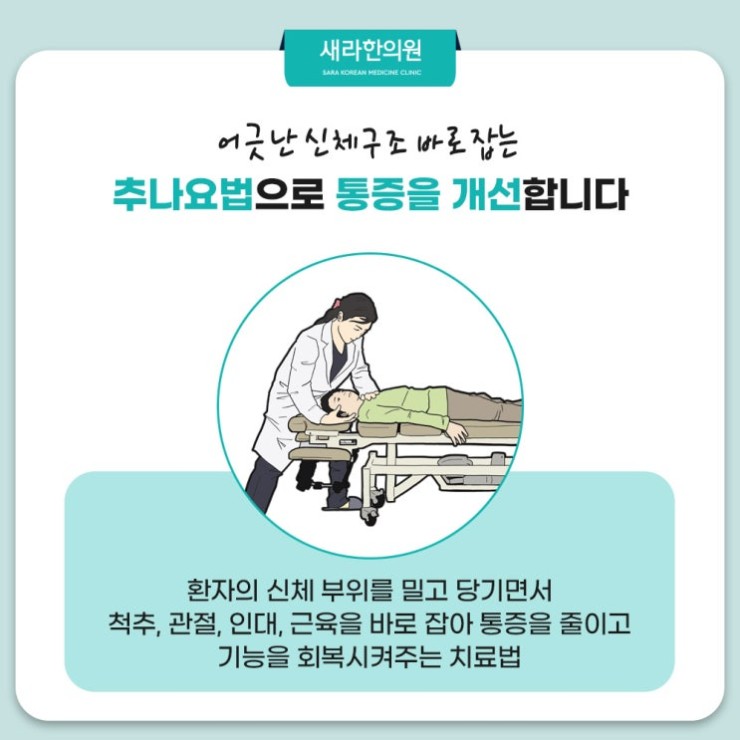 잘못된 자세로 생기게 되는 문제는 신체 불편함을 넘어서 심각한 구조적인 변형을 초래하게 됩니다. 이런 문제를 개선하고 신체 균형 회복을 위해서 저희 한의원에서는 신방화체형교정 추나요법 포함한 여러 치료를 제공드립니다. 추나요법은 한의사가 특수 제작한 추나 테이블을 활용해서 환자분의 척추, 관절, 인대, 근육 등의 불균형을 정밀히 조정하여서 신체 균형을 복원할 치료법이라고 한답니다. 이 수기 치료 방법은 복잡한 수술 없이 통증 완화와 올바른 자세로 복귀가 가능할 수 있게 합니다.