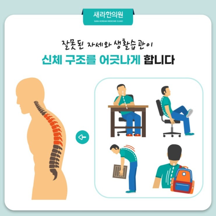 요즘에는 우리 일상에 스마트폰, 컴퓨터, 태블릿과 같은 전자 기기를 사용하는 분들을 어렵지않게 찾아볼 수 있는데요. 이렇게 IT 기기 사용이 일상화되어 장시간 잘못된 자세로 인해서 신체에 문제가 발생하게 되는 경우가 빈번히 나타나곤 합니다. 잘못된 자세를 지속한다면 시간이 지나면서 신체 구조를 점차 왜곡시켜 결국 신체 균형을 해치는 결과를 불러오는데요. 신체 균형이 깨진다면 근골격계 통증을 경험하고 경우에 따라 디스크와 같은 심각한 질환으로 이어집니다. 그래서 올바른 자세를 유지하고 건강한 생활습관을 가지는게 중요하며 이는 결코 간과하면 안되는 요소이기도 합니다.