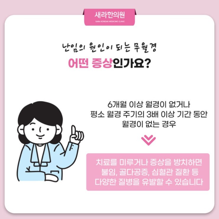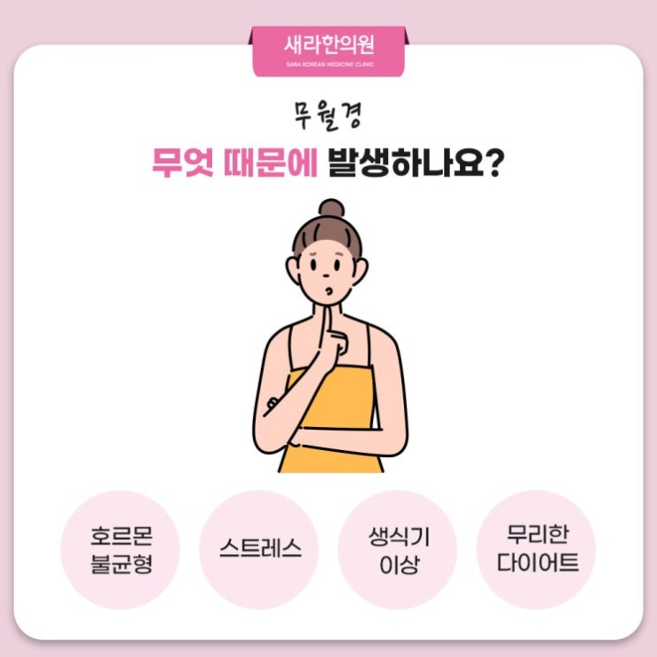 지금부터는 대표적 생리불순 증상 중에 하나인 무월경을 보다 자세하게 살펴보려 한답니다. 무월경은 일반적으로 월경이 6개월 이상 없거나 정상적인 주기의 세 배 이상 월경이 없는 상태를 의미하는데요. 이러한 무월경 상태는 불임이나 난임 가능성을 높이고 골다공증이나 심혈관 질환과 같은 다양한 건강 문제의 원인이 될 수 있어서 주의해야 한답니다. 그래서 무월경과 같은 생리불순 증상이 지속될 경우 적극적인 신방화무월경치료한의원 치료와 관리가 필요한데요. 무월경 증상 완화를 위해 적극적으로 한방 치료가 도움될 수 있을 것입니다.