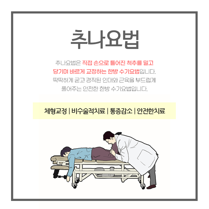 상태에 따라 강도와 방법이 조절되므로 비교적 안전하게 받을 수 있는 치료입니다. 추나요법과 더불어 침치료, 약침치료, 뜸치료, 부항치료 등 다양한 요법을 고려할 수 있습니다.