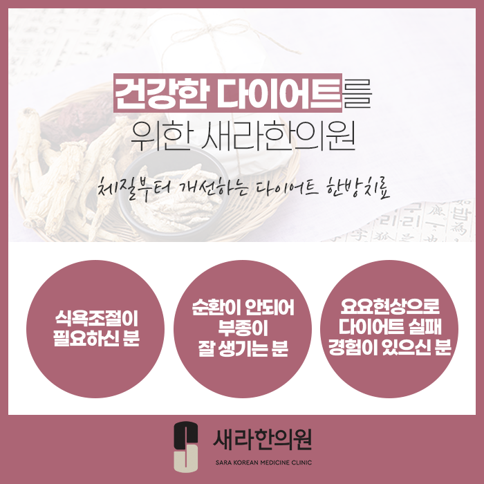 굶지않는 다이어트, 요요현상 없는 다이어트를 원하실 경우, 몸에 무리가 가지않게 진행되는 새라한의원의 다이어트 클리닉과 함께하시길 바랍니다.