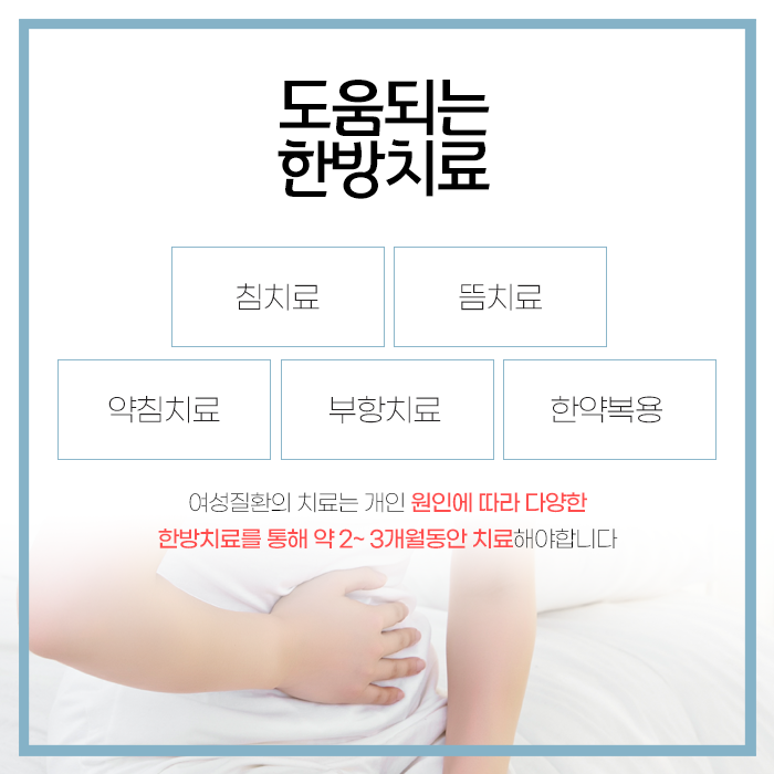 약재들은 자궁 내 환경을 깨끗하게하고 혈액순환을 원활하게 하여 어혈로 인한 출혈과 통증을 개선합니다. 무리한 다이어트를 피하고 평소 스트레스와 피로가 심하다면 충분한 휴식과 숙면을 통해 신체를 회복하시기 바랍니다.
