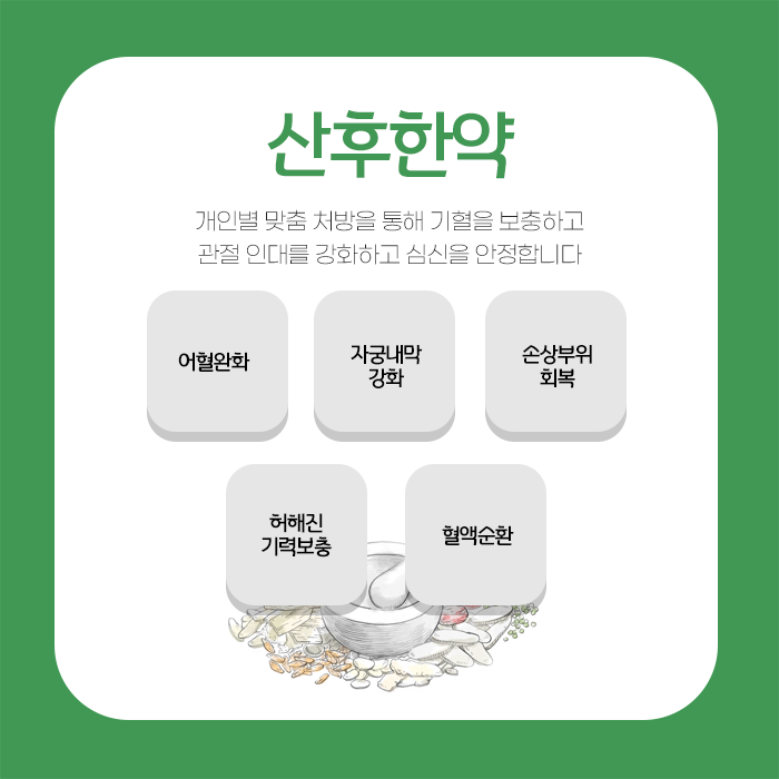 각기 다른 체질과 건강 상태를 가지고 계시며 아기를 낳으신 방식이나 출산 과정 또한 모두 다릅니다. 각자의 고유한 상태와 필요를 세심하게 고려합니다.