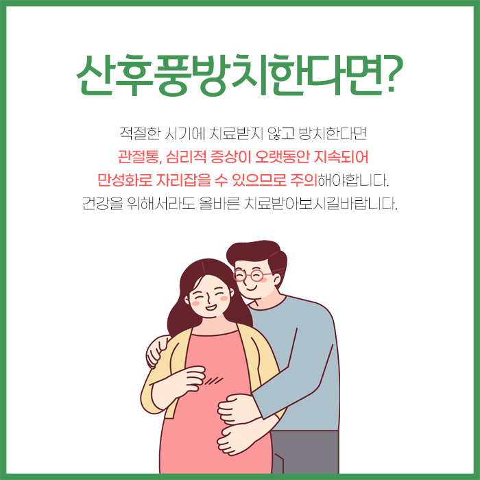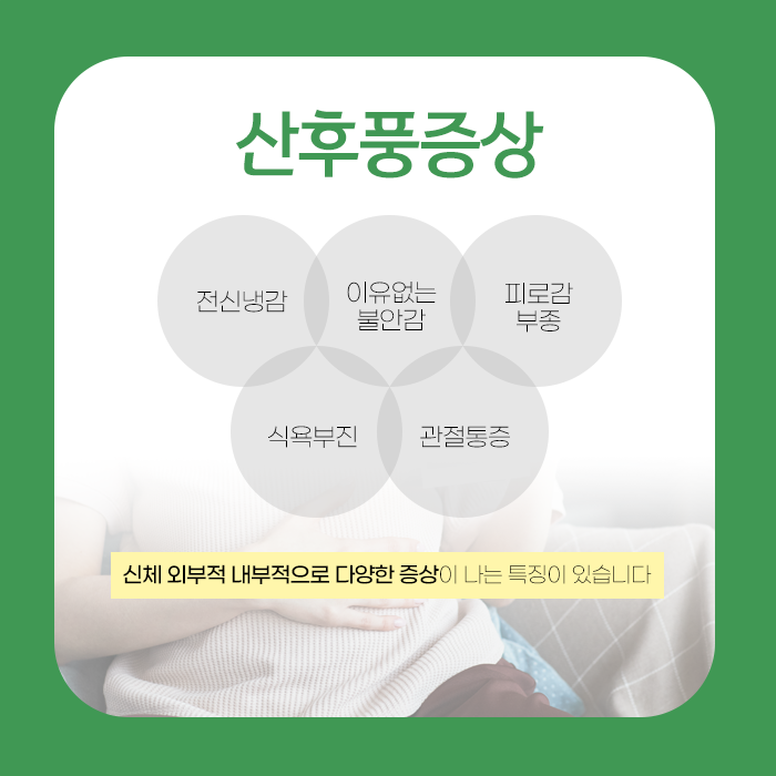 특히 찬 기운에 노출되었을 때 관절이나 뼈 속까지 파고드는 듯한 시린 느낌, 한기를 느끼기도 합니다. 이는 기산후에 몸의 방어력이 약해졌기 때문입니다. 출산 후 몸에 남아있는 불필요한 수분이나 노폐물이 제대로 배출되지 않아 부기가 잘 가라앉지 않고 오래 지속되면서 불편함을 느낄 수 있습니다.