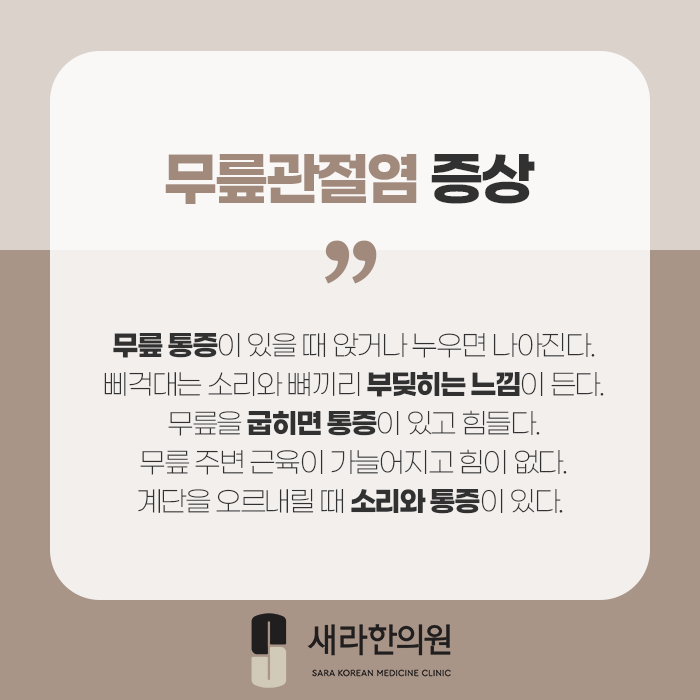 그러니 이같은 증상들을 한방으로 다스리는 마곡동무릎관절염치료 새라한의원으로 오셔서 도움을 받아보세요.