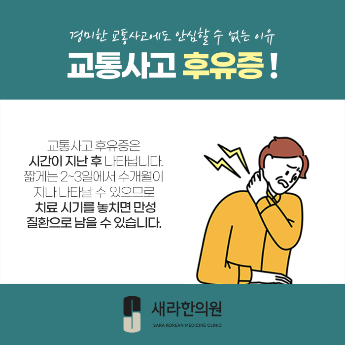 경미한 교통사고라 하더라도 방치한다면, 심신의 손상을 일으킬 수 밖에 없답니다.