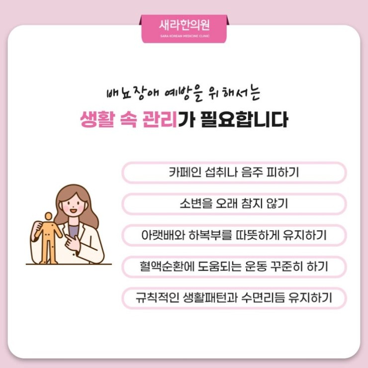 한방 치료로 다양한 병변 회복을 돕는 새라한의원에서는 마곡빈뇨 배뇨장애 개선으로 도움을 받아 볼 수 있는데요. 배뇨는 소변을 요도 바깥으로 배출하는 행위이며 배뇨장애는 소변을 볼 때 생기는 여러 이상 증후라고 생각하면 됩니다. 정상적인 삶을 살아가려면 다양한 배뇨 시 발생하는 이상을 서둘러 치료할 수 있게 해야 한다고 얘기드립니다.