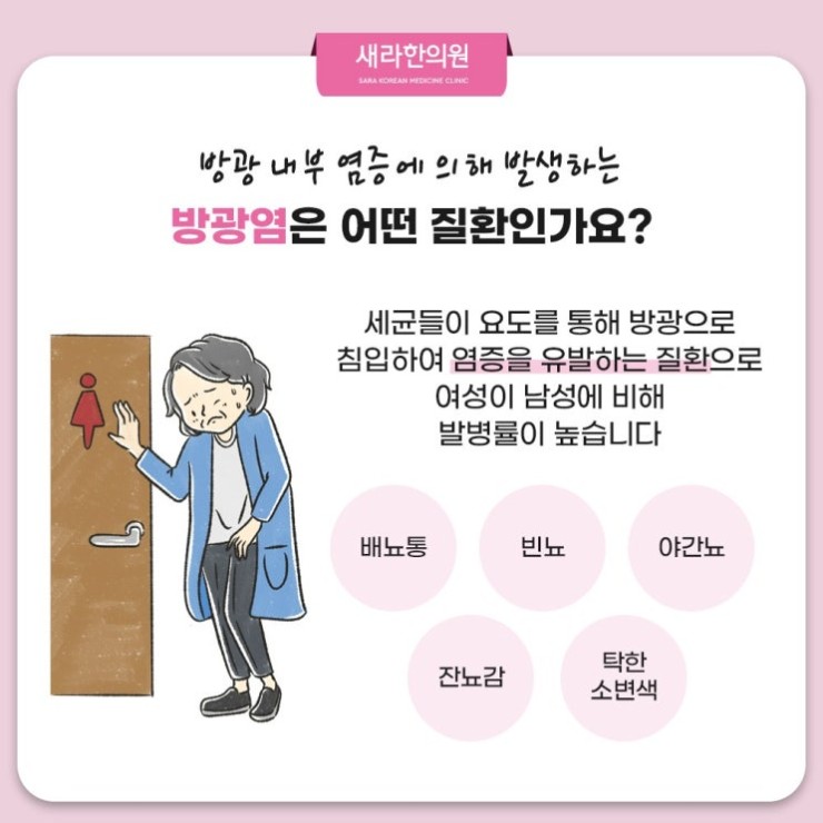 방광염을 더불어 절박뇨 혹은 야간뇨 같은 증상이 찾아오면 과민성 방광을 의심할 수 있습니다. 이는 방광에 소변이 충분히 차오르지 않았는데도 때와 장소를 가리지 않고 요의가 느껴지는 특징이 보입니다. 방문을 하면서 이렇게 어떤 방광 문제가 있는지 확인하는 것이 가능할 수 있고 그 다음 마곡빈뇨 한방치료로 회복까지 도움을 드리려 합니다.