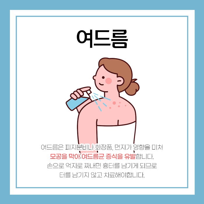 각질이 탈락하지 못하고 모공 입구에 쌓여 모공을 막는 현상이 발생합니다. 모공이 막히고 피지가 고이면 여드름균이 증식하기 좋은 조건이 됩니다.