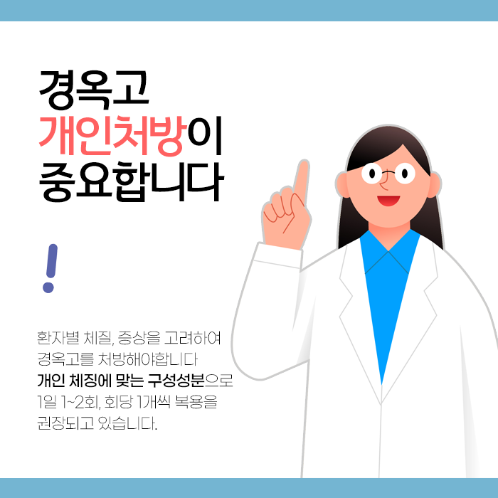 예상치 못한 증상이 나타나거나 기존의 증상이 악화되는 경우 즉시 상담해야합니다. 면역력이 저하되어 신체 기능이 약해졌다면 경옥고를 통해 도움을 받아 건강을 증진하시기 바랍니다. 남녀노소 누구나 복용할 수 있는 보약이지만 개인의 체질과 건강 상태에 따라 적절한 처방이 중요합니다.