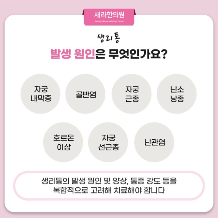 생리통은 여성 대부분 경험하는 일반적인 증상 중 하나로 원인은 매우 다양하답니다. 자궁내막증, 골반 염증, 자궁 근종, 난소 낭종, 호르몬 불균형, 자궁 선근종, 난관 염증 등이 생리통을 유발하는 주요 원인으로 꼽히는데요. 생리통은 크게 원발성, 속발성 생리통으로 나뉜답니다. 원발성 생리통은 특정 골반 질환의 존재 없이 발생하고 혈액 순환 장애, 습열, 자궁 냉증과 같은 상태의 치료로 개선할 수도 있습니다. 반면 속발성 생리통은 골반 내 질환으로 발생하고 이 경우 해당 질환 치료로 통증을 덜어볼 수 있습니다. 이에 따라 생리통이 있다면 원인을 정확히 파악하고자 적절한 진단을 받아보는게 중요하고 이를 통해서 효과적인 치료 방향을 결정합니다. 생리통으로 인한 불편함을 겪는다면 개인 상태에 따른 신방화부인과 치료 방법을 찾는게 무엇보다 중요할 것입니다.