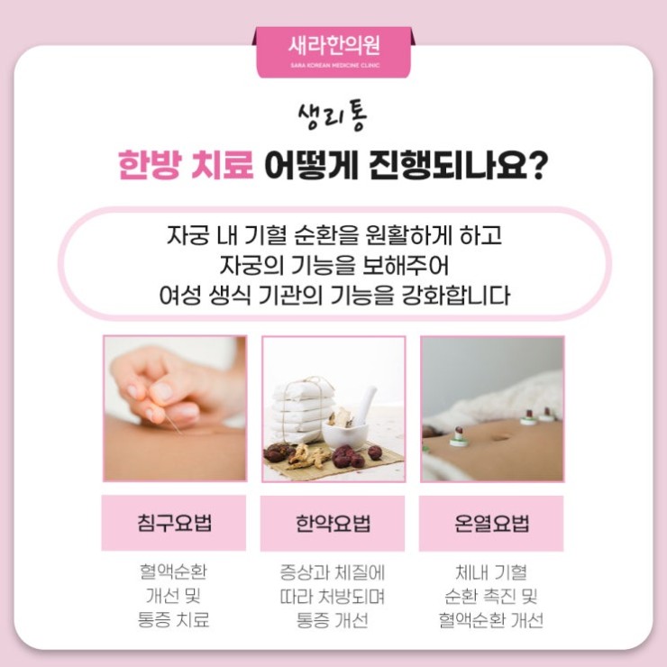 생리통 완화를 위한 대응책으로 많은 여성분이 진통제를 사용하는 경우도 많은데 지속적이고 심한 생리통은 한의학으로 개선할 가능성이 클 수도 있답니다. 관련 질환을 치료하는 저희 한의원으 한약 요법을 중심으로 자궁 내 혈액 순환 촉진, 근육 긴장 완화로 생리통을 줄이는 신방화부인과 치료를 이루는데요. 이와 함께 자궁의 전반적인 건강을 향상시킬 여러 한방 치료를 제공드립니다. 관련 질환을 치료하는 저희 한의원의 치료 접근 방식은 침요법, 약침요법, 온열요법 등의 여러 한의학적 방법을 활용해서 자궁의 혈액 순환을 개선하고 기능 강화에 초점을 맞추는데요. 이런 질환에 대한 한의학 치료법은 여성 생식 기능 증진과 생리통 관련 증상 개선에 도움이 될 수도 있습니다. 생리통이 심하다면 한의학적 접근을 고려해보는 것이 좋은 방법일 수 있답니다.