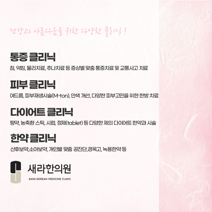 각종 질병 및 통증, 교통사고 후유증, 다이어트 클리닉, 피부 클리닉 등의 다양한 클리닉을 통하여 건강과 아름다움을 함께 찾아드리기 위해서 최선을 다하는 신방화골반염 한의원 새라한의원!