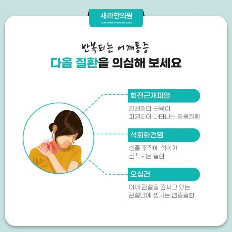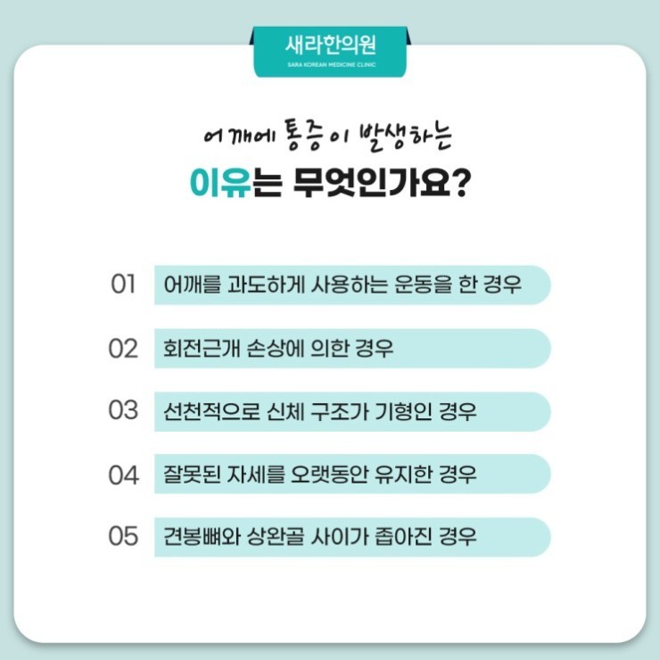 새라한의원은 다양한 근골격계 질환의 상태를 검진하며 치료하는데 도움을 드리고 있답니다. 이번에 얘기하려는 것은 어깨 부분 통증에 대한 것입니다. 어깨는 사람이 가진 모든 관절 중 360도 회전이 가능하단 특징이 있으며 넓은 운동성으로 자유로운 움직임을 확보해주는데요. 이런 어깨가 다양한 이유로 통증에 시달리면서 가동 범위도 저하되면 자연스럽게 삶의 질이 떨어질 수밖에 없을 것입니다.