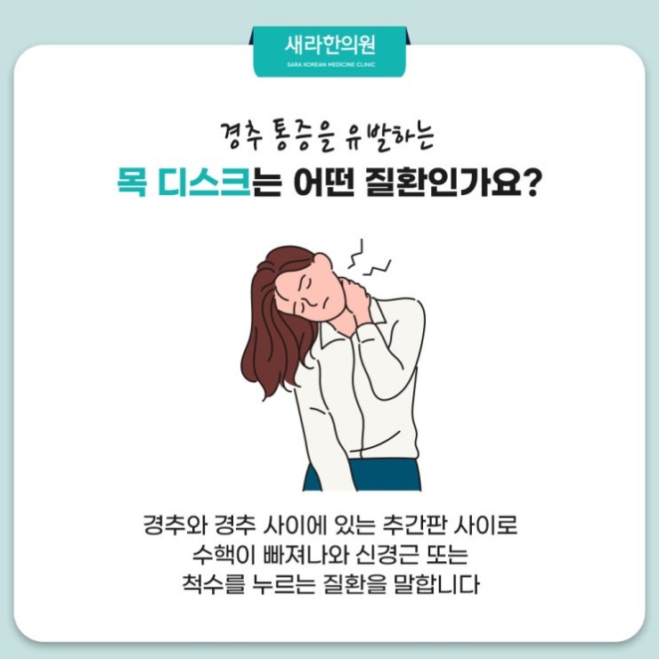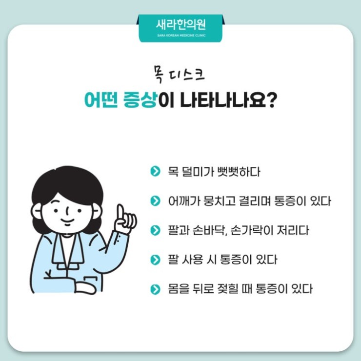 목디스크는 경추에 있는 디스크(추간판) 문제로 인해 발생하고 주변 신경이나 척수가 압박을 받아 통증을 유발하는데요. 이런 상태는 목, 어깨, 등, 가슴 부위 통증을 더불어 팔의 통증, 저림, 두통까지 경험하게 만듭니다. 특히 목 디스크 증상이 악화한다면 통증이 등, 허리, 골반 등 신체 다른 부위로 확산되는데요. 그래서 목 디스크는 초기에 정확한 진단을 받고 적합한 치료를 시작하는게 매우 중요하답니다. 저희 한의원은 특히 일자목, 거북목, 목 디스크 등과 같은 경추 관련 질환이 치료를 위해서 여러 한방 신방화역목디스크 치료법을 제공해 환자분의 증상 개선을 도와드립니다.
