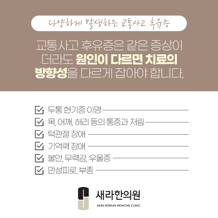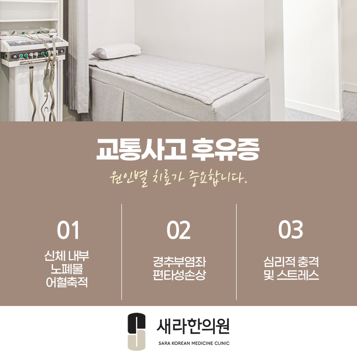 복합적으로 나타나는 교통사고 후유증은 시간이 지난다고 자연적으로 회복하길 기대하기 보다 초기에 적극적으로 치료를 받는 것이 가장 안전하답니다.