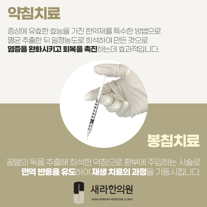 봉침은 꿀벌의 독을 추출하고 희석한 약침으로 환부에 주입하는 시술이에요.
