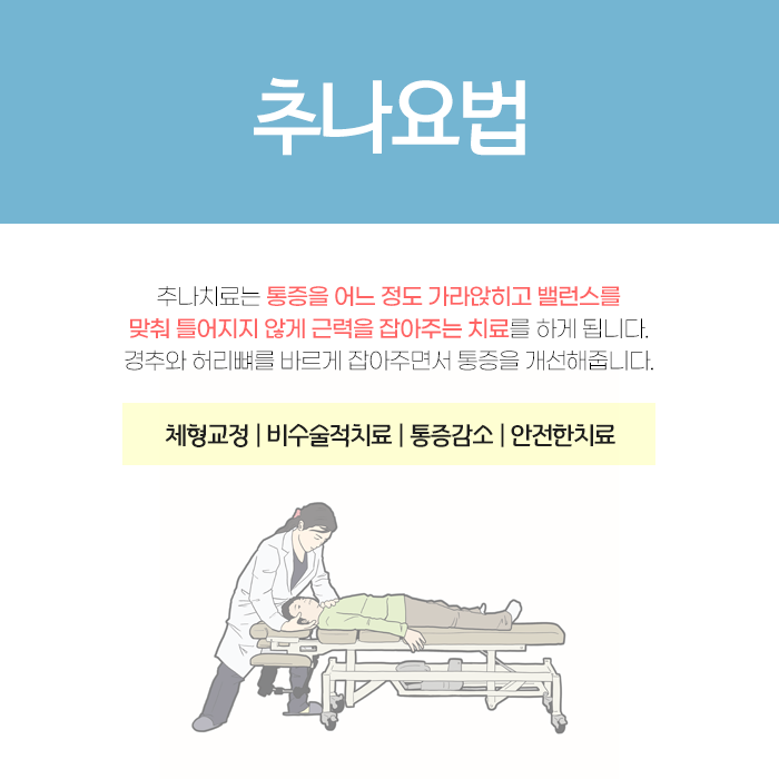 추나요법은 직접 손이나 신체 일부를 이용하여 척추와 관절의 불균형을 교정하고 긴장된 근육을 이완시켜 통증을 완화하는 데 중점을 둔 수기요법입니다. 다양한 관절 질환으로 인한 통증 관리에 효과적입니다. 수술 없이 진행되는 비침습적 치료이므로 안전하고 편안하게 받으실 수 있습니다.