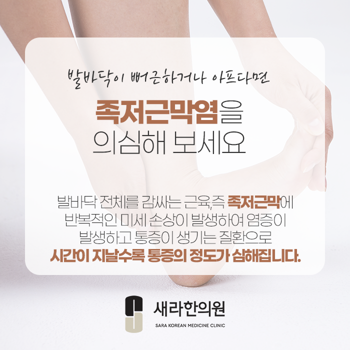 발바닥에 통증을 느낀다거나 뻐근한 느낌이 들어서 고민하신다면, 족저근막염을 의심해보면서 적절하게 치료를 받으셔야 하겠습니다.