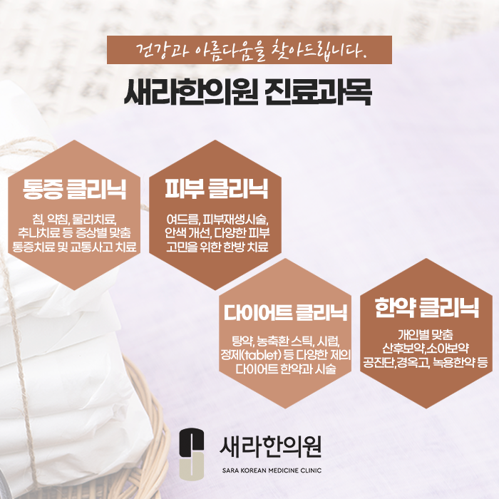신방화족저근막염 치료 도와드리는 새라한의원은 침, 약침, 부항, 추나, 한약 처방 등의 다양한 한방 치료가 종합적으로 진행되고 있습니다.