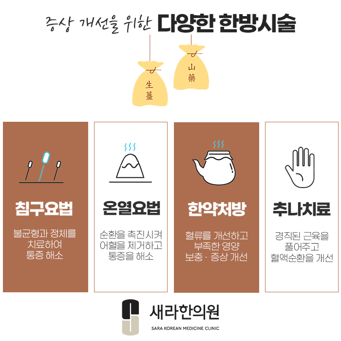 그리고 신체의 불균형을 요인으로 나타난 염증 및 통증의 경우, 다양한 한방 치료 솔루션을 더하여 몸의 균형을 바로 잡고, 보다 더 문제를 개선해볼수가 있겠습니다.