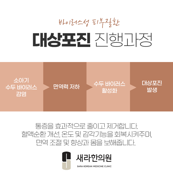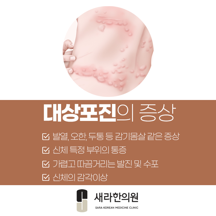 그리고, 면역력 저하가 원인이기에 면역이 저하된 근본적인 원인을 명확하게 살펴보아야 하고, 몸 상태를 회복하고 대상포진 증상 치료와 함께 면역력 증진까지 함께 고려해 치료해야 합니다.