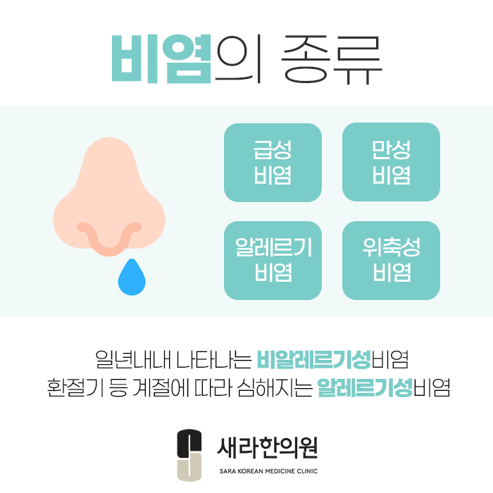 그리고 혈관, 코 점막의 부종으로 인해 혈관 운동성 비염, 노인성 비염, 약물성 비염 등이 있지요.