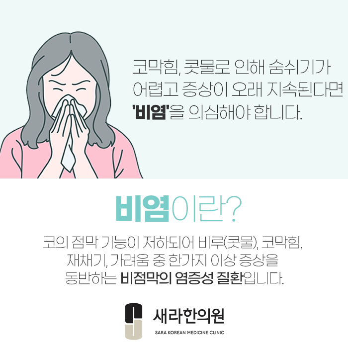 코가 막힌다거나 콧물로 인해서 숨 쉬기가 어려우며, 답답한 증상이 오랜 시간 지속될 경우, 단순히 감기로 여기지 않고 ‘비염’이 아닐지 의심해 보는 것이 바람직하겠습니다.