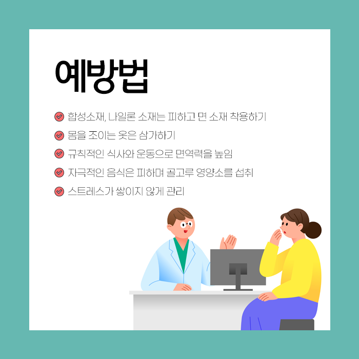 질염을 악화시킬 수 있는 자극적이거나 기름진 음식, 단 음식을 줄이고 면역력에 좋은 균형 잡힌 식단을 섭취하합니다. 통풍이 잫되는 좋은 속옷과 하의 착용, 월경 기간 중 위생 관리, 올바른 외음부 세척 방법 등을 기억하는게 좋습니다.