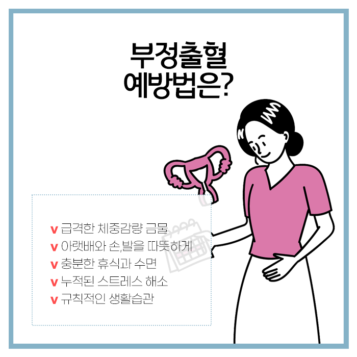 생리 기간이 아님에도 불구하고 출혈이 관찰된다면 신체 어딘가에 이상이 있다는 신호입니다. 방화부정출혈이 발생하는 원인은 다양하며 스트레스나 피로 때문이라고 치부하기 어려운 경우가 많습니다. 스트레스, 과로, 불규칙한 생활, 수면 부족, 호르몬 변화 등은 호르몬의 균형을 깨뜨려 부정출혈을 유발할 수 있습니다. 초기에는 특별한 증상이 나타나지 않다가도 월경이 끝난 뒤 출혈이 발생하거나 출혈 외 다른 증상이 뒤늦게 나타날 수 있으므로 세심한 주의가 필요합니다.