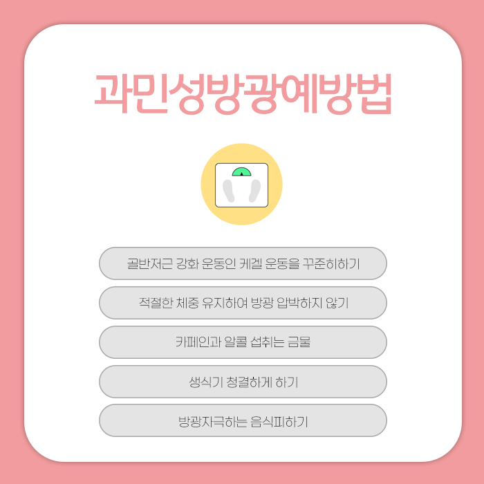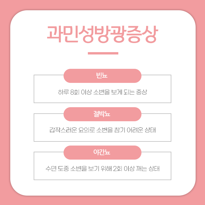 빈뇨는 평소보다 화장실에 가는 횟수가 현저히 늘어난 상태를 말합니다. 2시간에 한 번씩 화장실에 가는 것을 넘어 30분~1시간 간격으로 계속 소변이 마렵다면 빈뇨를 의심해야합니다. 급박뇨는 갑자기 참기 힘들 정도로 소변이 마려운 상태를 뜻하며 심하면 화장실에 가기 전에 소변이 새는 요실금으로 이어지기도 합니다.