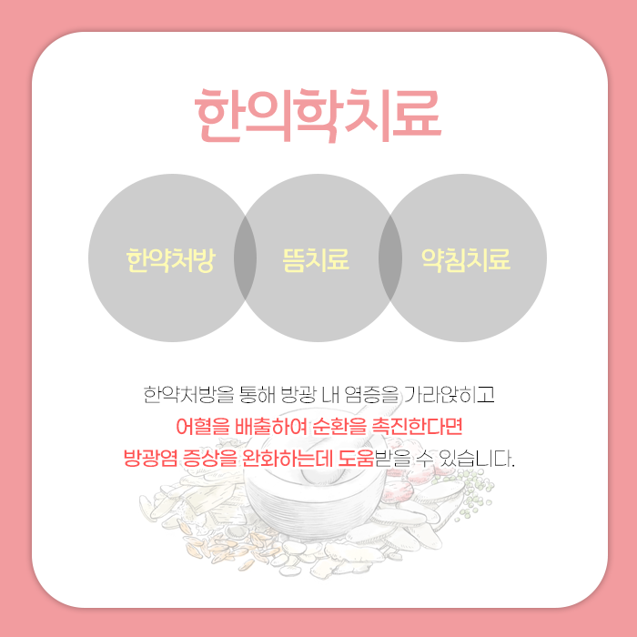 방화빈뇨치료한의원 한방치료에서는 방광염 개선을 위해 한약복용과 함께 침치료, 뜸치료 등 다양한 방법을 병행하며 오래 지속되거나 자꾸만 반복되는 염증 상태를 개선하고 방광의 기능을 튼튼하게 만들도록 돕습니다.