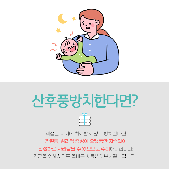 관절은 기혈의 흐름에 민감한 부위라 충분한 회복 없이 무리한 움직임을 반복하면 쉽게 통증이 나타날 수 있습니다. 뼈 마디마디가 시리다고 표현하는 산후풍의 원인이기도 합니다. 또 한 가지 중요한 관점은 기운이 약해져 외부의 찬 기운에 취약한 상태가 됩니다.